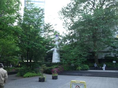 地下鉄銀座駅を出るとすぐの、泰明小学校の隣にある小さな公園です。まわりを賑やかな繁華街に囲まれている中で、中は緑も豊富でホッと一息つける場所になっています。岡本太郎作のユニークな形をした時計塔が立っていて、とても目立っていました。