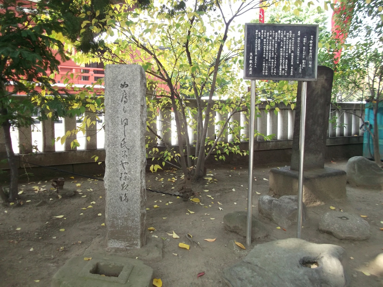 浅草神社の境内の一角にこの石碑が立っていました。初代吉右衛門は大正・昭和期を代表する歌舞伎役者であり、また高浜虚子を師事して句集も出していたそうです。石碑は自筆の文字だそうですが、達筆過ぎて読みづらいです。案内板によると「女房も同じ氏子や除夜詣」と彫られているそうです。