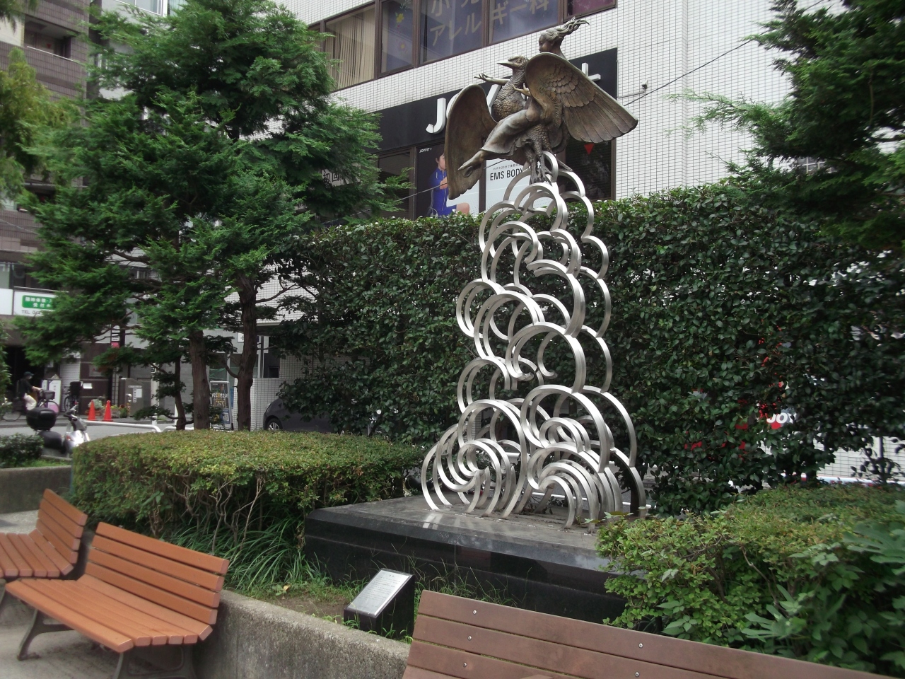 麻布十番の網代公園内にある、麻布十番に点在する微笑みのモニュメントの一つです。ほかのモニュメントは小さい作品が多い中でこちらは大きく、日本人の作家の作品です。戦災から復興したこの地域について、愛と夢、生命のあるものとの共生をテーマに製作されたものだそうです。