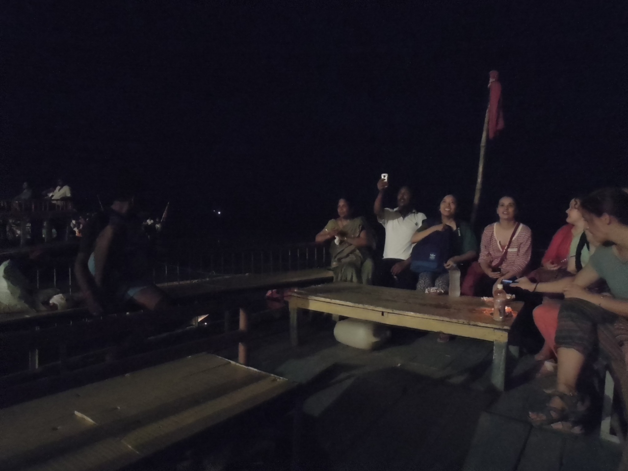 普段は7人が一箇所に固まってやっているようですが、2箇所のレストランで半々に分かれてやっていました。陸に居ると何も見えないので、川に停留しているボートに50ルピーで載せてもらい見学しました。それでも遠すぎて何やっているかイマイチわからず、かなり長い時間やっていたので、飽きてしまいました。- 旅行時期
