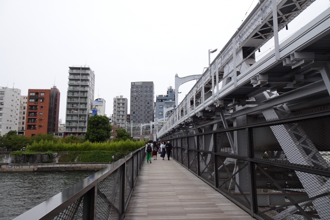 東武スカイツリーラインの下に並行して歩道の橋が造られていて、隅田川を歩いて渡ることができます。浅草からここを渡り、高架下に造られて細長い商業施設東京みずまち、スカイツリータウンと歩いてアクセスできるようになっています。