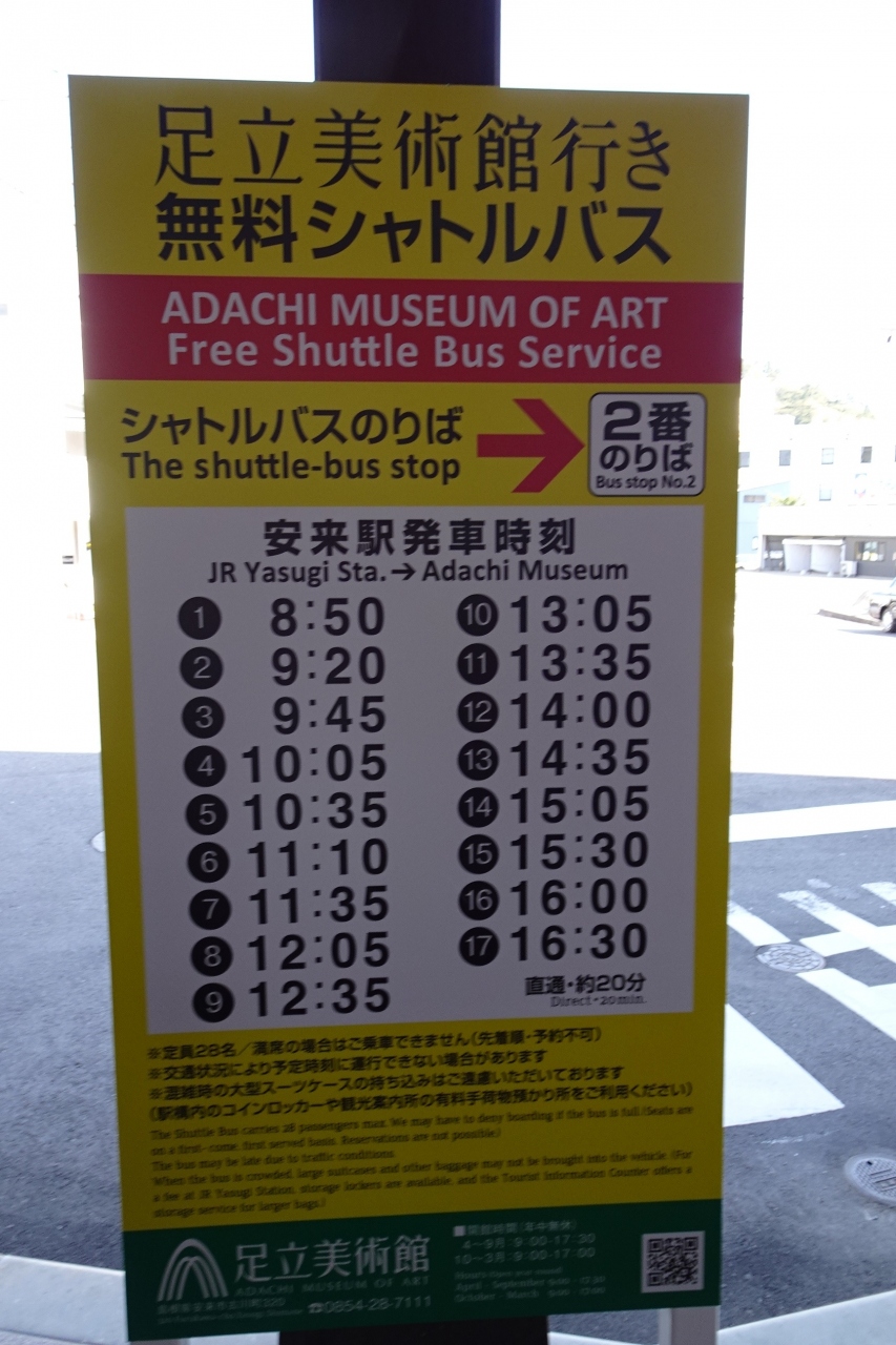 安来駅からシャトルバスでアクセスしました。観光客が多いので、シャトルバスには乗り切れない方続出ですが、路線バスも同時に走っているので、シャトルバスに乗り遅れても大丈夫でした。20分ほどで到着します。