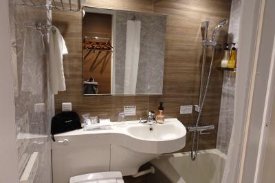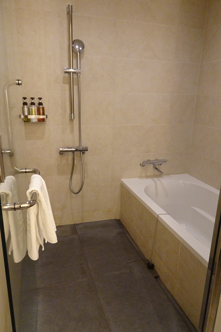 建物は少し歴史を感じます。お部屋は、たまたま泊まったお部屋がバリアフリーに特化したお部屋だったのか、介護施設のような洗面所とお風呂でした。