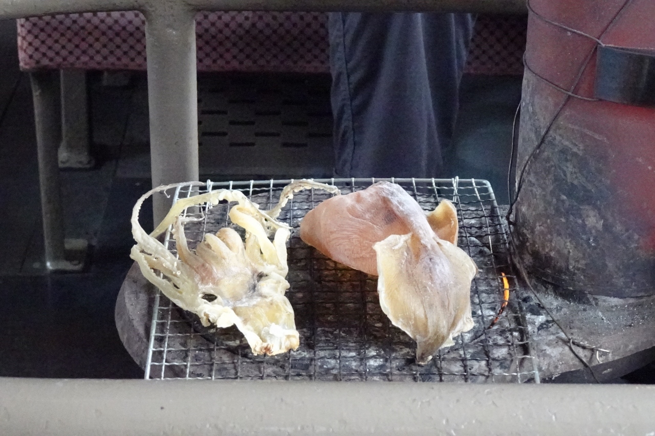 ダルマストーブを囲んで焼きスルメと地元の日本酒をいただくのが通の乗り方です。