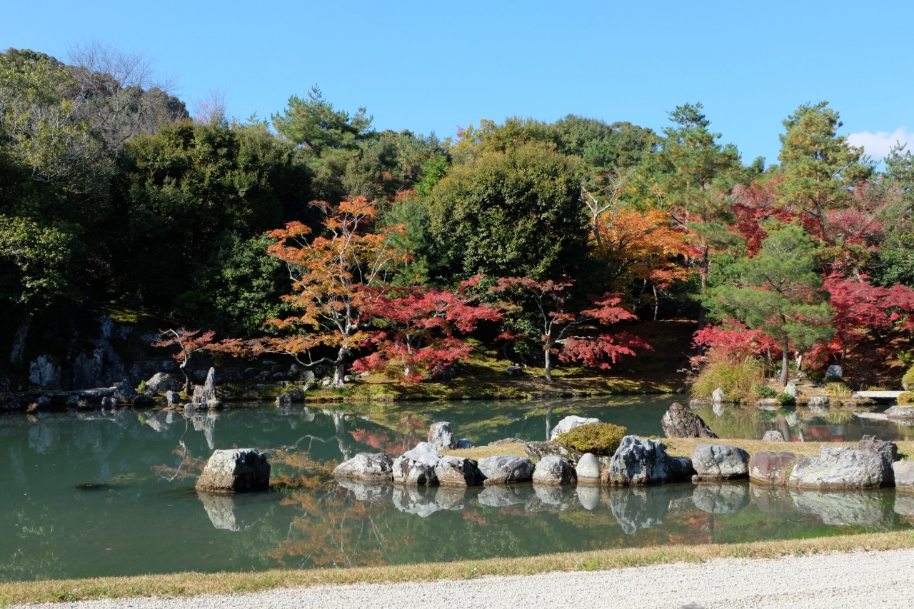 世界遺産でもあり、嵐山を借景の創源池庭園の四季折々の風情も素晴らしく、今回は紅葉の季節に行きました。