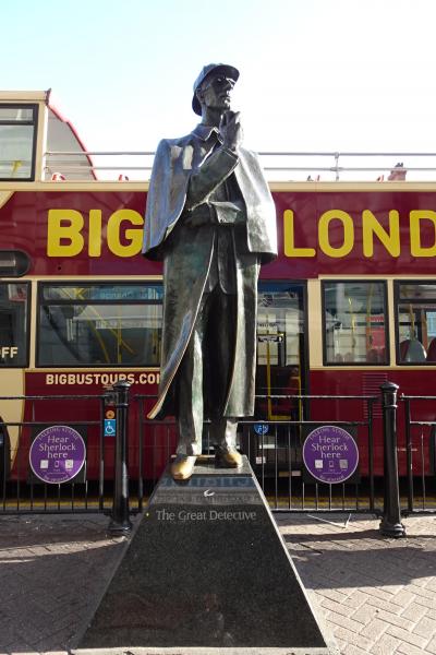 近くにはシャーロックホームズ博物館もありますが、少し離れた賑やかな通りに突然ポーズを決めて立っているのでびっくりします。あまりにカッコいいので、一緒に写真を撮りたくなります。シャーロックホームズ博物館前の行列、大人気ぶりを見た後この像の前に来ましたが、ここはあまり人がいませんでした、不思議と。