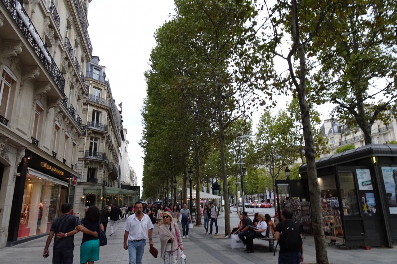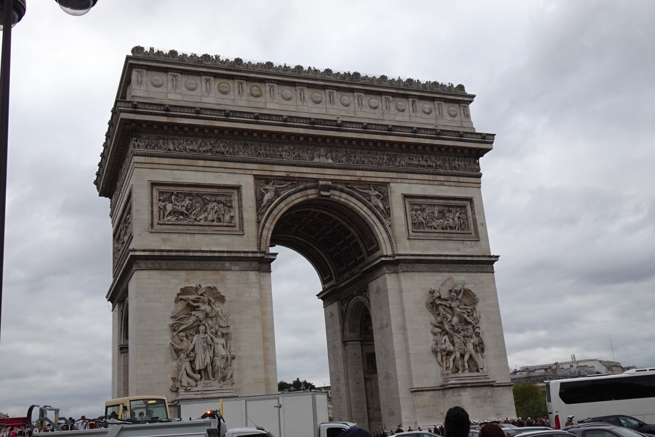 シャンゼリゼ大通りを西にのんびり散策してたどり着く凱旋門ですが、その畏怖堂々とした姿に圧倒されます。ナポレオンが戦いに勝って建てさせた凱旋門。周囲は戦いを表わしたレリーフが見事です。つい見上げてしまいますが、スリに要注意、観光客も多く混んでいます。三百段近くの階段で上まで上がって展望台から見下ろす景色は素晴らしいようですが、上ったことがありません。次回は行ってみたいと思いますが、凱旋門は見上げるだけで満足しています。
