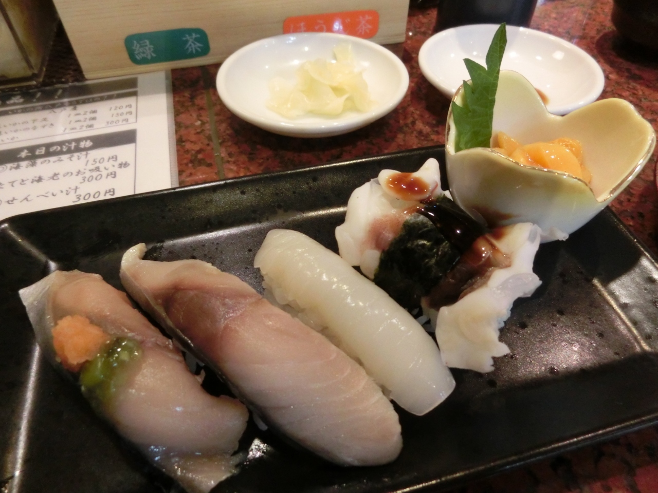待たずに座れました。お寿司のセットが何種類かあり、一貫ずつ何種類も食べることができました。ネタは市塲内ですし、期待通り新鮮で美味しい。