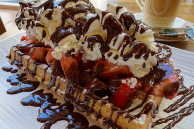 ブリュッセル風ワッフルにイチゴソースとチョコを注文。予想以上の生クリームとチョコ、それに甘さが強すぎて、生クリームは少し食べただけに終わりました。