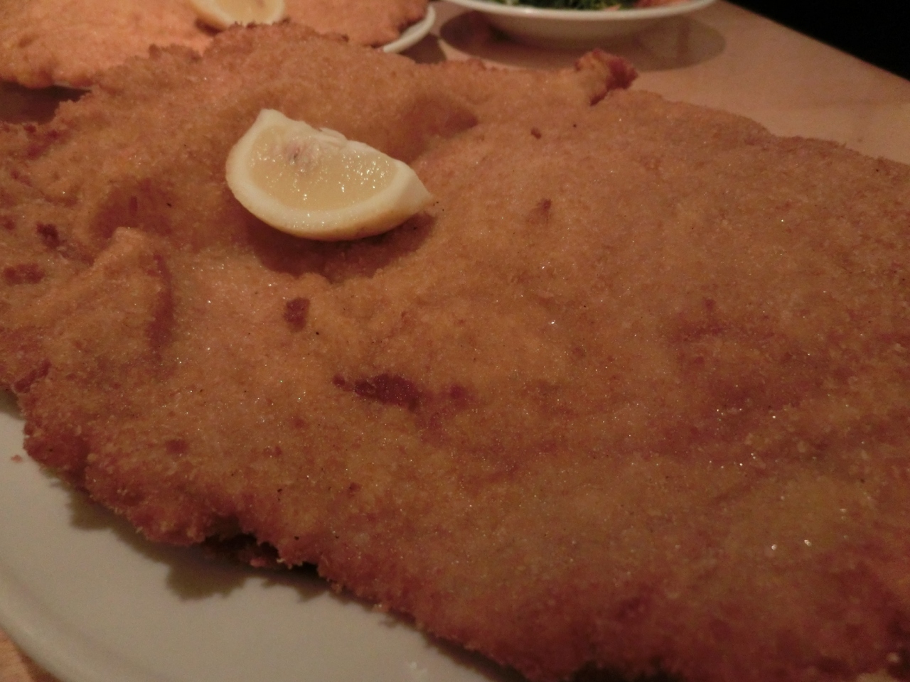 女子なら2人で1つで十分です。大きすぎてびっくりなシュニッツェルです。