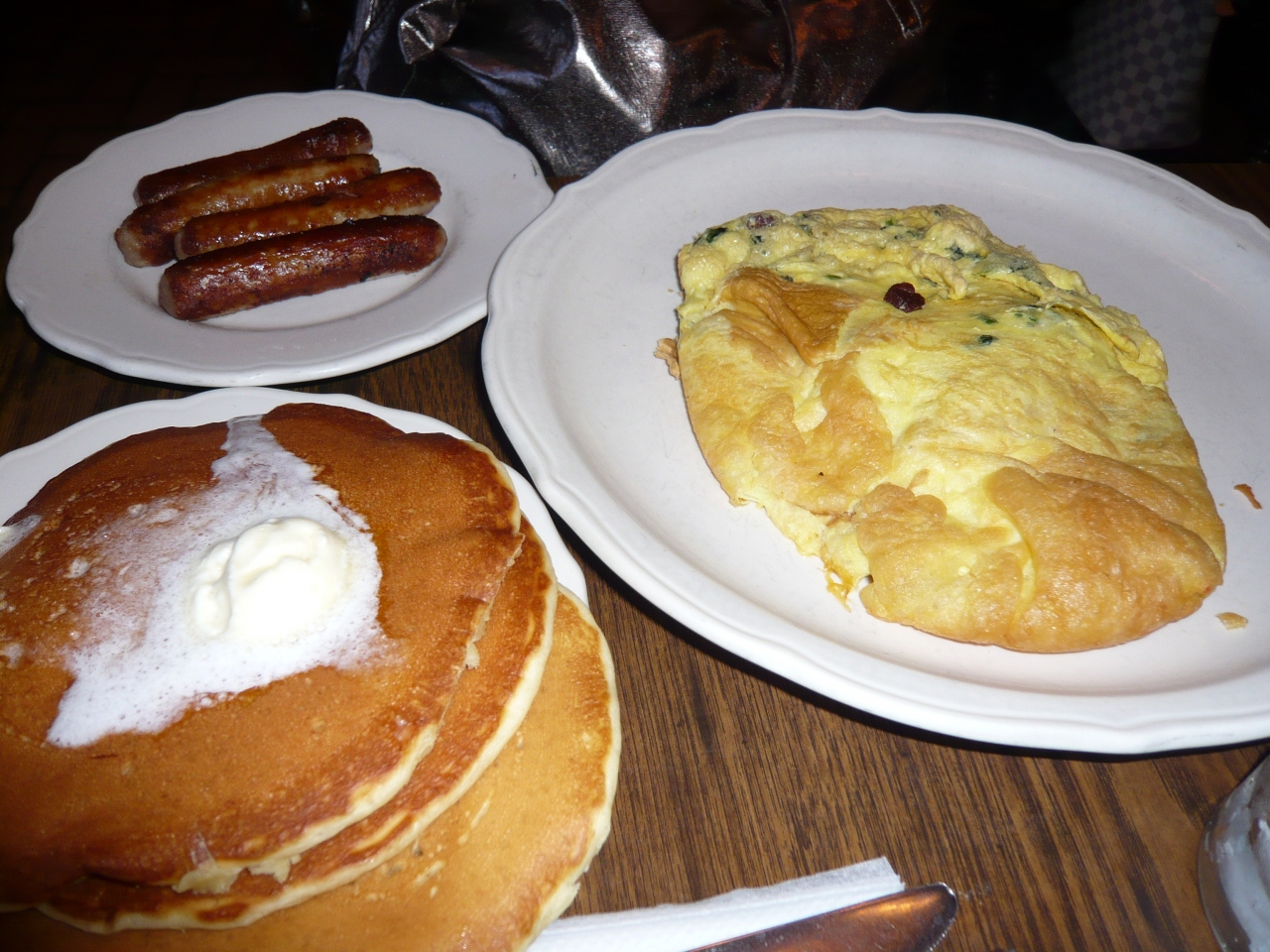 写真は、ほうれん草のオムレツ&パンケーキ+ソーセージです。女子2名で丁度良い量でした。