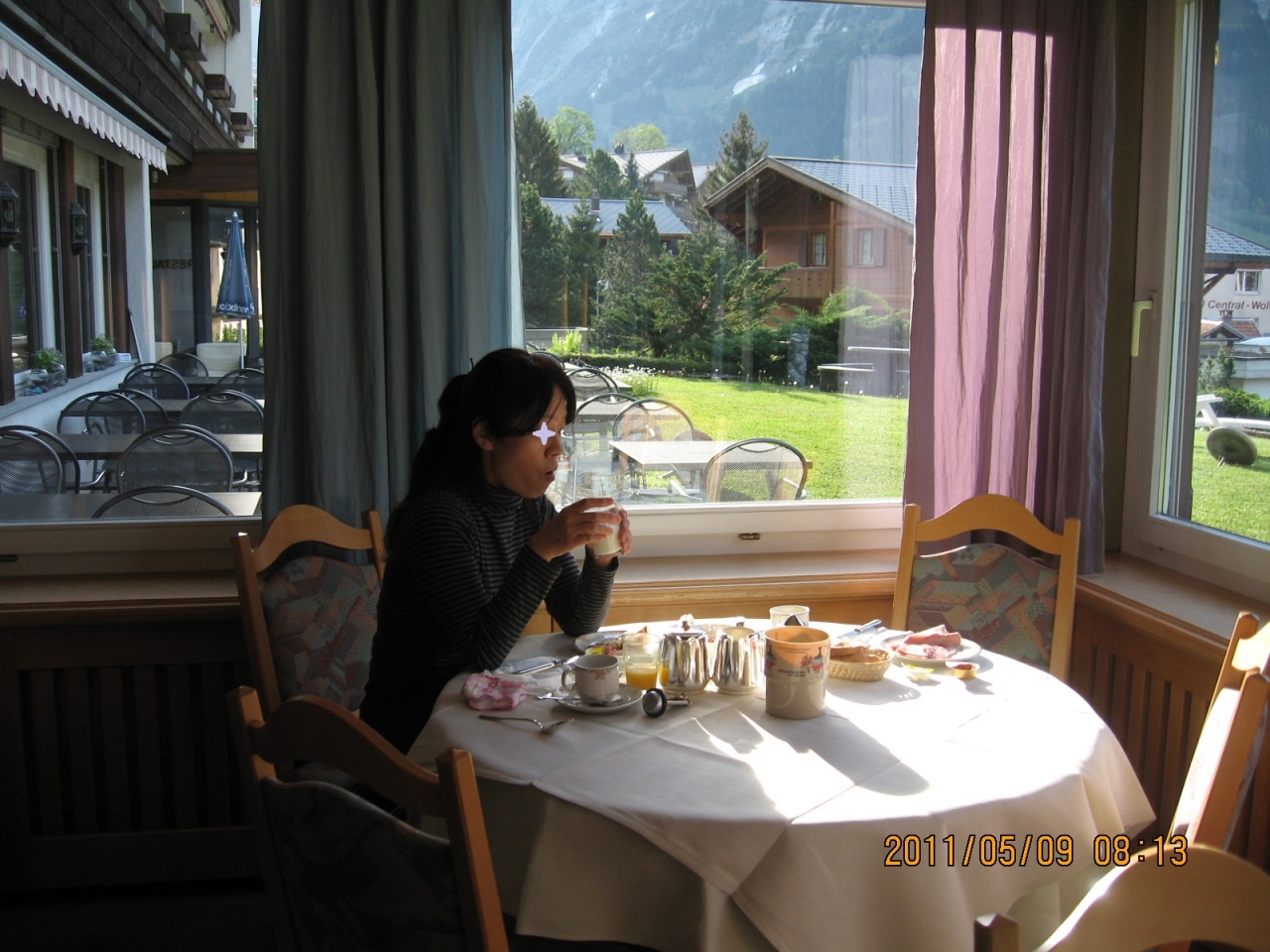 グリンデルワルト駅から直ぐのところにある、アット・ホームな雰囲気のホテルですが、場所を平面で見ていたので、実際に行ってみると入口までは坂道になっていて、大きな荷物を持っていると、ちょっと大変かも・・・