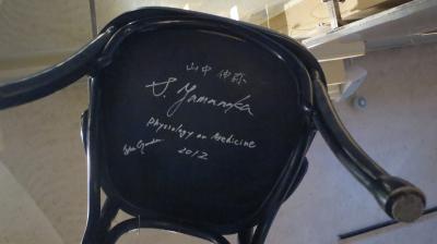 iPS細胞で有名になった山中教授のサイン入り椅子も天井から吊り下げてありましたのでこちらも写真を撮りました。