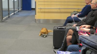 搭乗口に行くと、犬を連れたおばさんが椅子に座っていました。