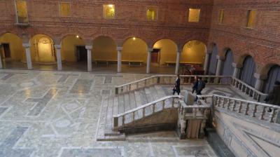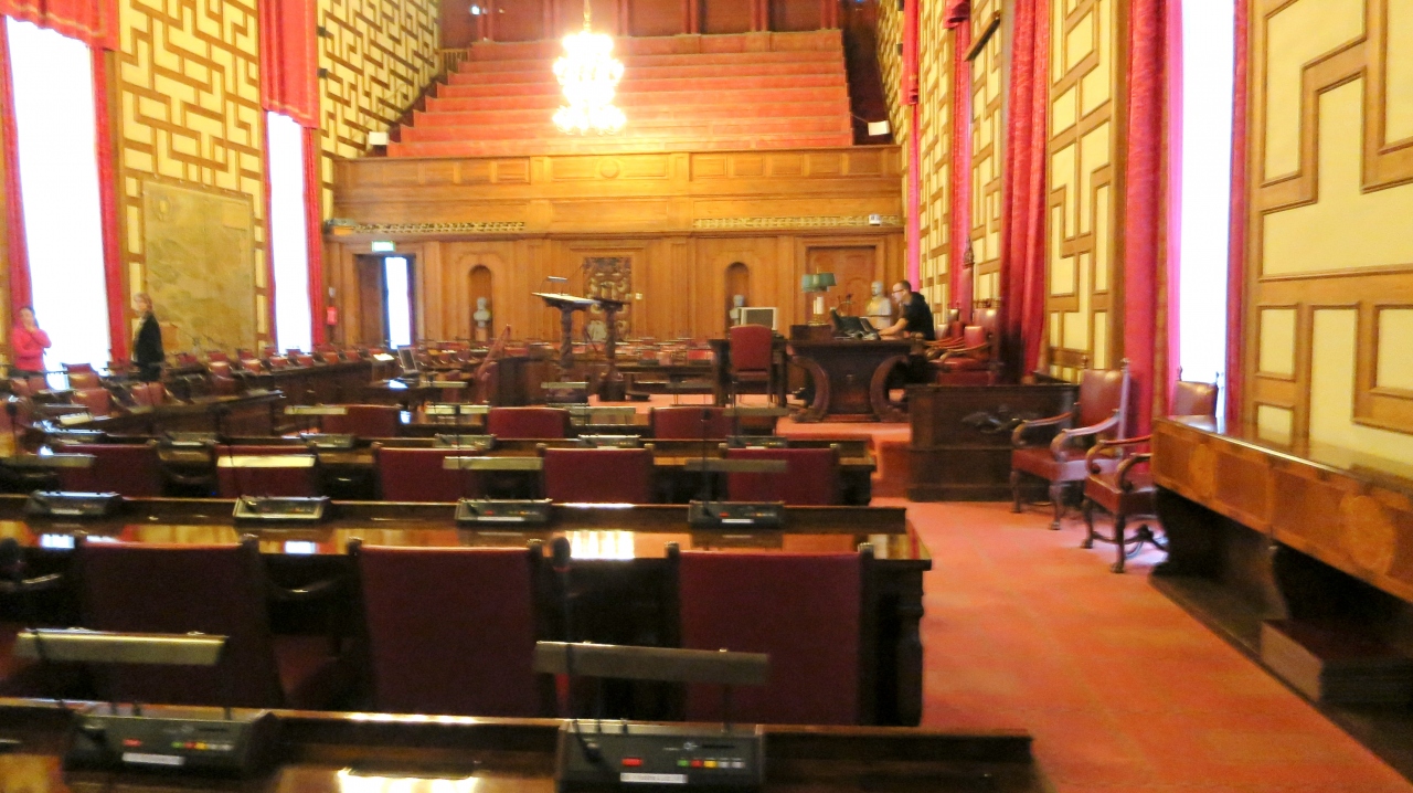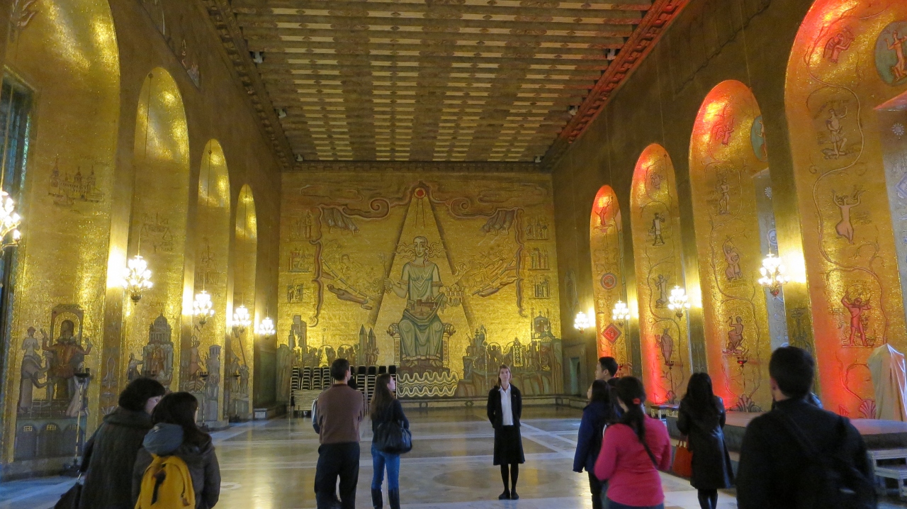 最初に、ノーベル賞受賞後の晩餐会が開かれるブルーホールへ入って、説明を聞いた後、市議会の議場、楕円形の「オバーレン」という部屋、プリンスのギャラリー(鏡の間)、スリークラウン(3つのシャンデリアの部屋)から黄金の間と見て回りました。