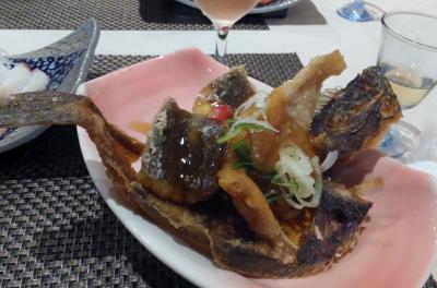 夕食は、海鮮料理でどれも美味しく、名物のカレイの唐揚げもバリバリいただきました。