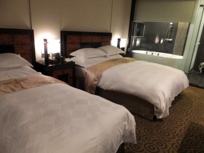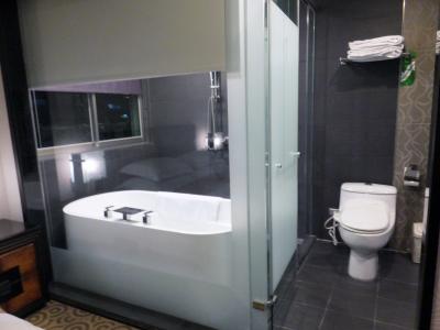 部屋は、シックでとてもいい感じ、広くてベットからお風呂が丸見えで驚きますが、ロールカーテンがあってちゃんと隠れます。
