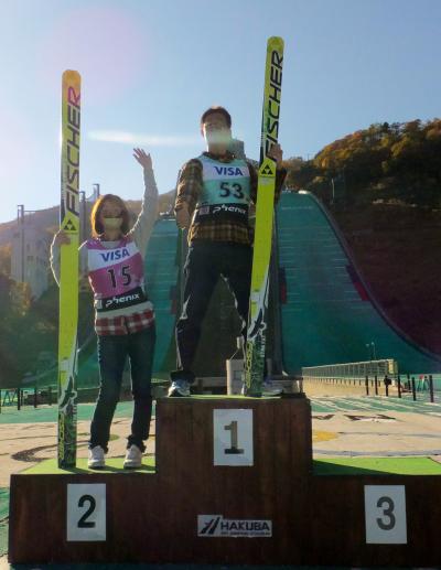 こちらへくるのは2回目ですが、前回と違い、着地点の所に、表彰台・スキー板・カメラの三脚などが置いてあり、ジャンプ台を背に撮影ができるようになっていました。