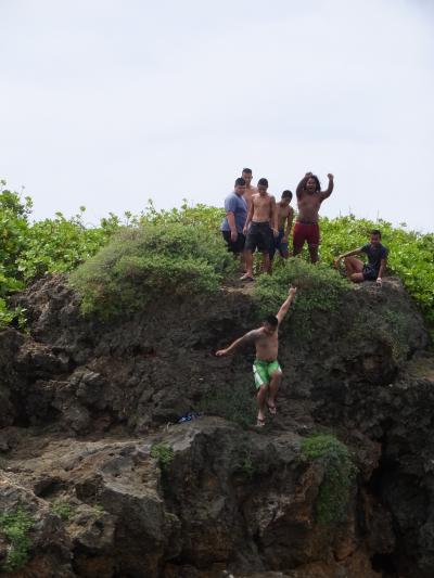 イナラハン天然プールは、海水が溶岩でせき止められできた天然のプールで、飛び込み台もあって現地の方が遊んでいます。