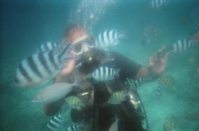 ダイバーが餌付けをしていて、ダイバーが手を振ってくれます。