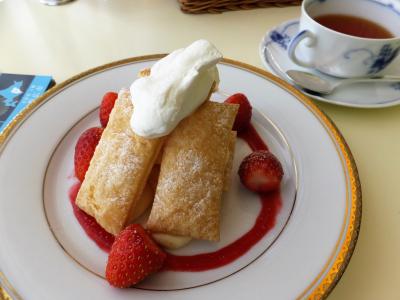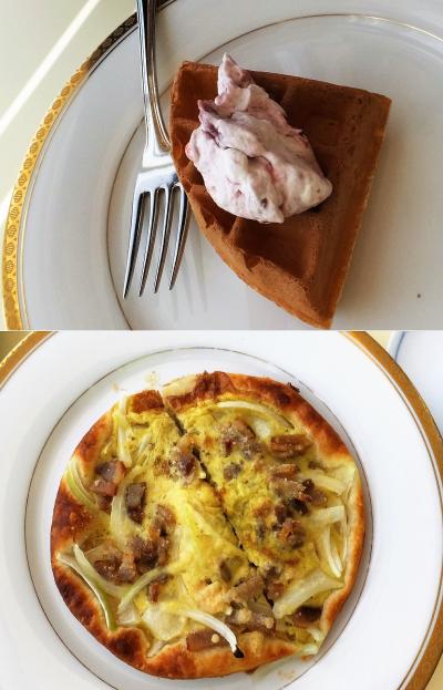 そして、2階の喫茶店で、サクサクワッフル 苺クリーム 190円 外はカリッ、中はふんわりとしたワッフルと、薄焼きキッシュ 500円 を いただきました。