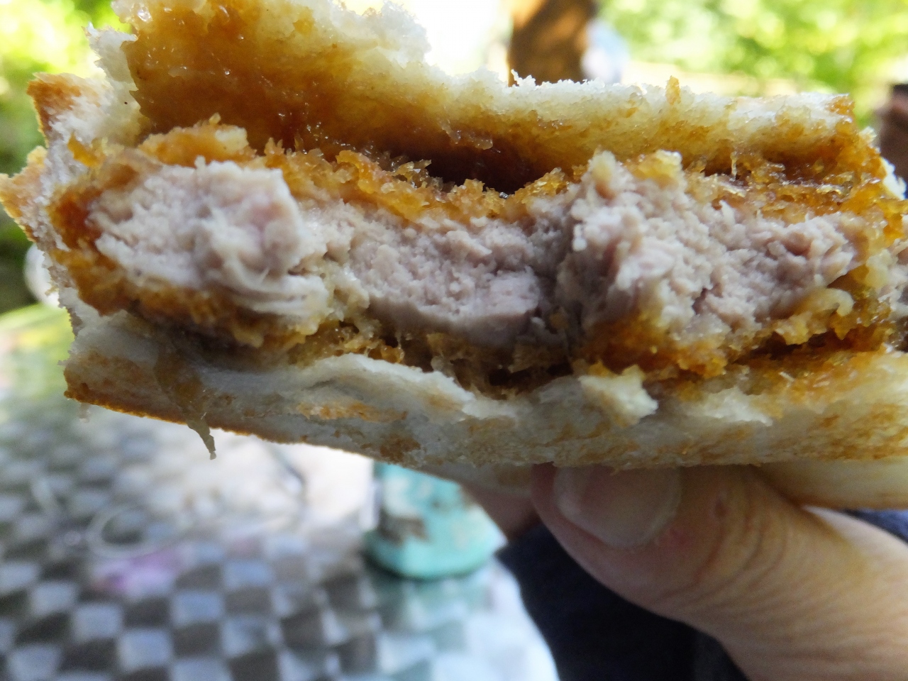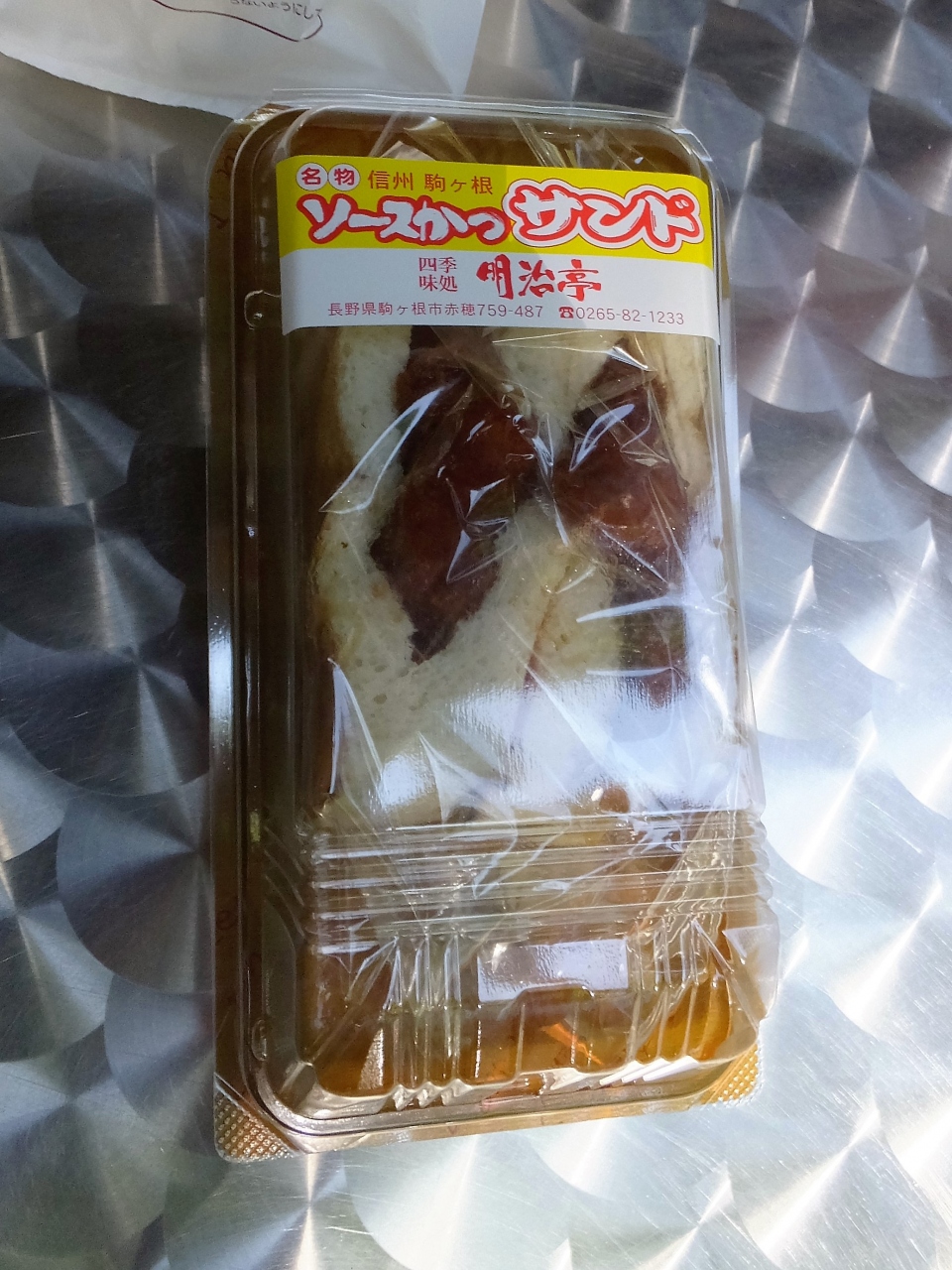 お昼はおにぎりを千畳敷で食べてきたので名物のソースかつ丼は食べれなかったので、ソースかつサンドをテラス席でいただきました。