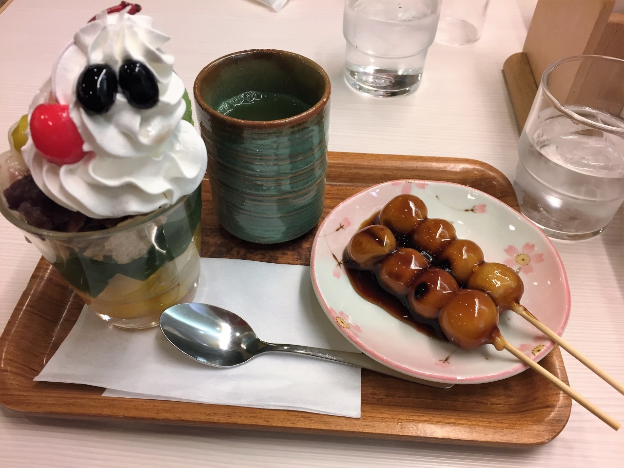 京あんじゅセット(和パフェとみたらし団子)と 抹茶黒蜜ラテ(だったかな)を頼みました。みたらし団子は、甘い醤油だれで、少し小ぶりの団子です。- 旅行時期