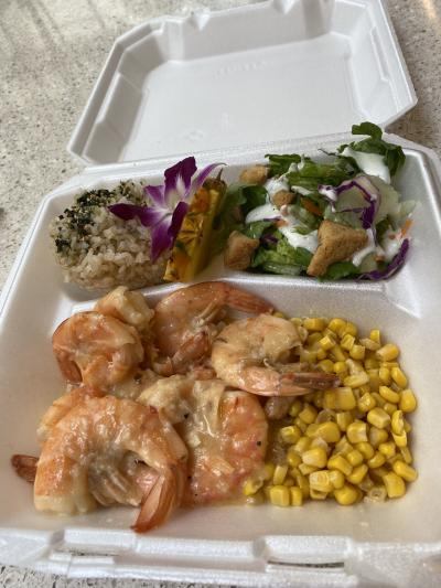 フードコートでガーリックシュリンプです。殻を巻くのも面倒なくらい疲れて...