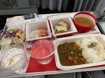 カレーです。ラウンジのカレーの方がまだマシな感じ。スープがあったのでス...