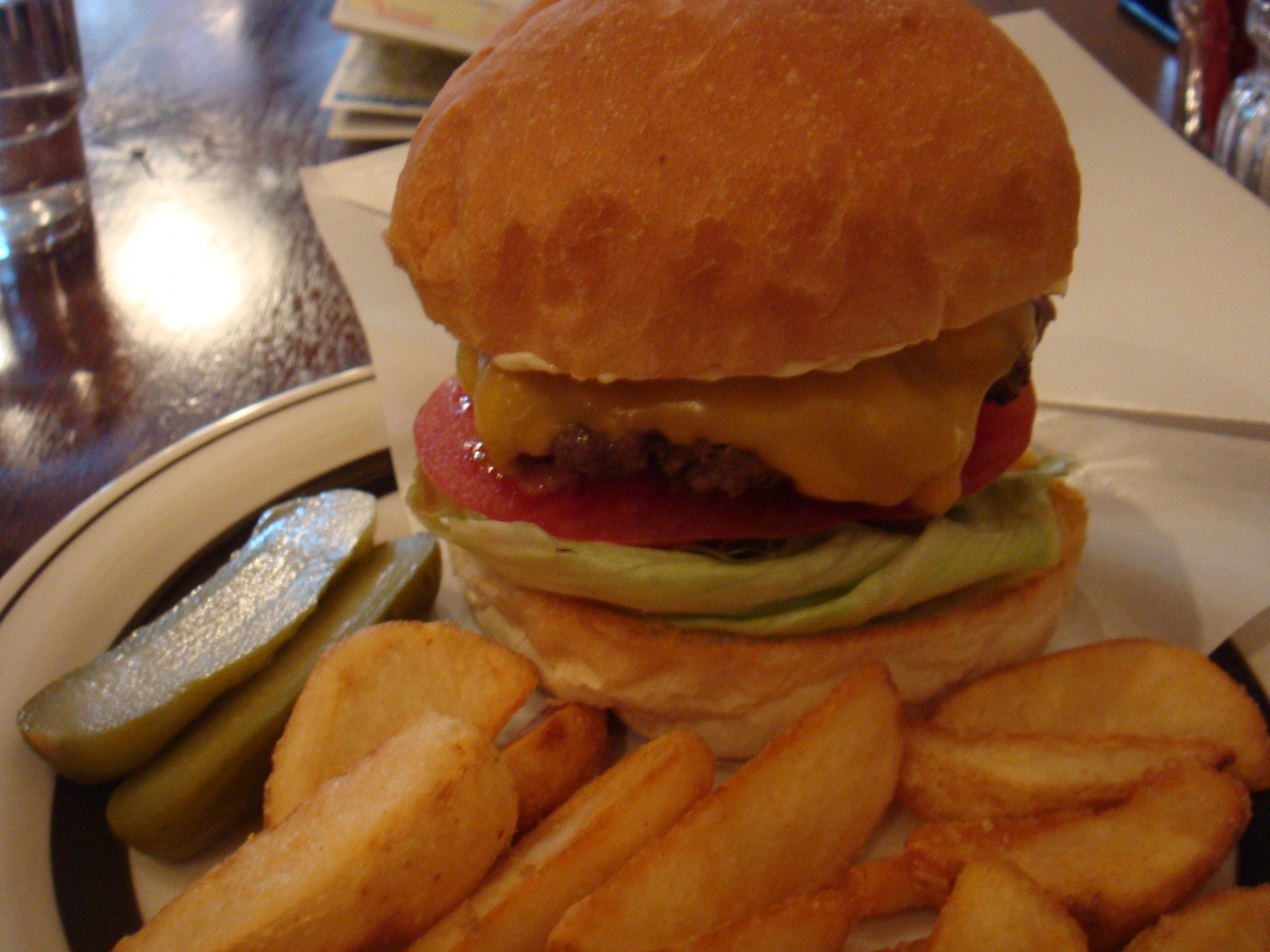 チーズバーガー840円に、各105円のピクルス・フレンチフライを添えていただきました。