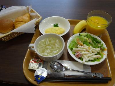 もれなく簡単な朝食がついていて、サラダ、スープ、フルーツ、飲み物がブッフェになっており、温めたパン2種と一品が出される形式です。一品、は初日が小さなオムレツ、二日目がソーセージでした。ご飯を食べないとダメ、という方でなければ充分な内容だと思います。