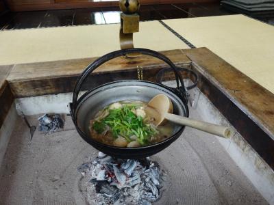 いただいたのは山の芋鍋の定食1500円です。お鍋とご飯、それに山菜などの小鉢が3つついたもの。お鍋も量がたっぷりで美味しかったですが、小鉢がぜんぶよいお味で。ちょっとお高めかなーとは思いますが、一人なのに囲炉裏に火を入れてくださって、よい雰囲気のなかでしたので、満足です。おすすめできます。