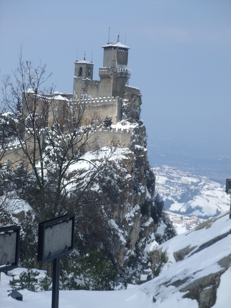 フィレツェからユーロスターに乗り、リミニまで。そこからバスに乗り、全部で3時間以上かけてやっとサンマリノへ。前日に大雪が降ったため、一面の銀世界を見下ろせる要塞は、まさに天空の城のよう。空気もすごくきれいで、眼下の街並み、海、自然も壮大で、とにかく素晴らしい空間を体験できました。行ってよかった!