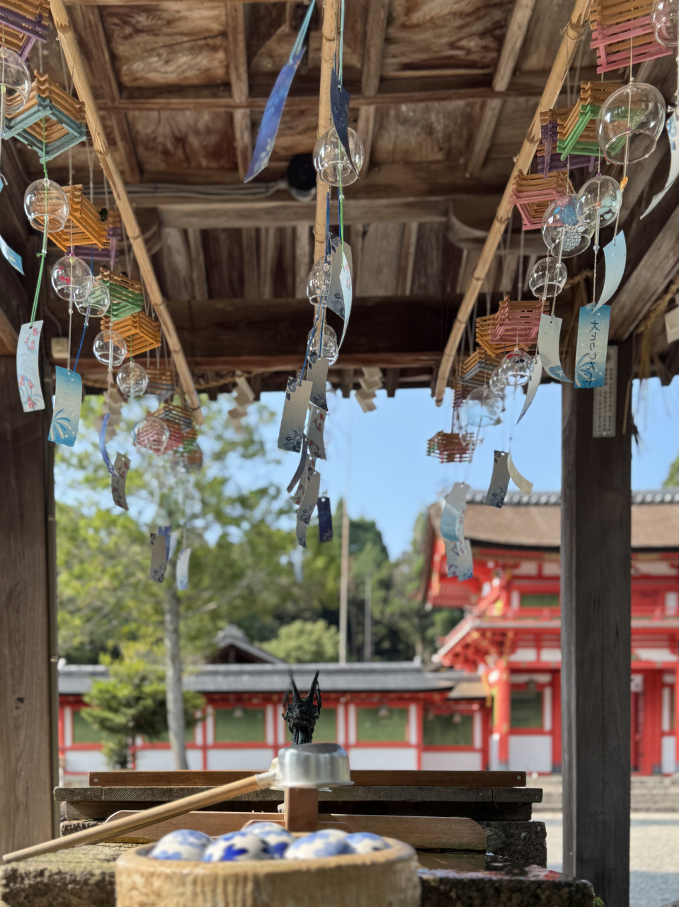 そんな大鳥神社が甲賀市夏詣の〝風鈴まつり〟の会場となると知り、今回訪れてみた。初参加ということで規模は小さく、手水舎一帯を飾り付けたものではあったが、初めての試みということで〝風鈴まつり〟見学を兼ねている参拝客がちらほら見かけられた。勿論規模の大きさだけではその価値が決まるものではないにしろ、もう少し目を惹くようなものにすれば…という残念な気持ちが残ってしまった。ド派手な朱塗りの楼門・回廊が背景となれば、それなりに〝見せ方〟を考えないと背景に埋もれてしまう…。