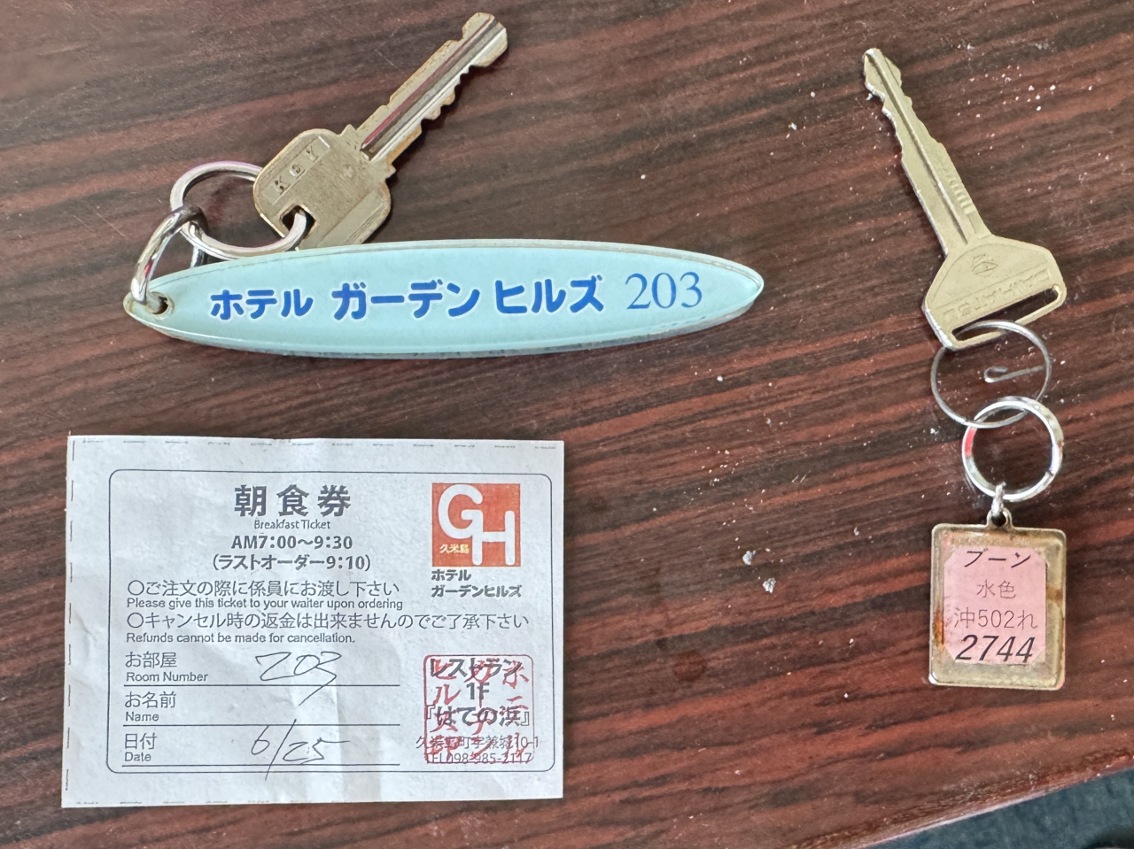 久米島の宿として選んだホテルガーデンヒルズ。本当は2食付きのプランを選びたかったのだが、夕食の提供はされておられなかったが〝値段〟第一に考えて選んだ。元々他のホテルを改修して今のものになったようで、施設には階段しかなく荷物の多い方には不向きかもしれない。部屋も清掃が行き届いており奇麗ではあるが、どうしても建物の古さは否めないため、その辺りは個人の価値観に左右されるところだと思われる。