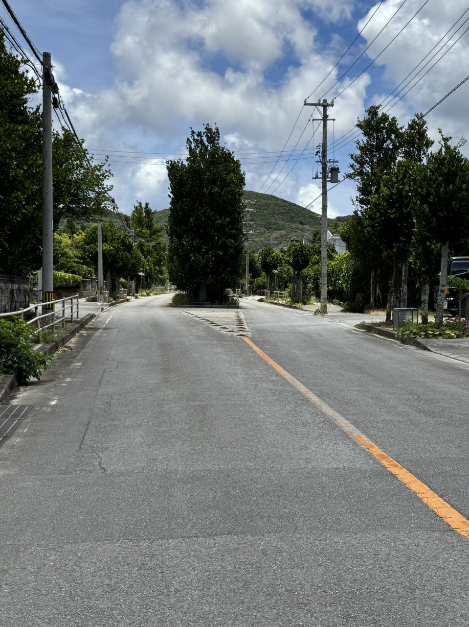 久米島にあるおばけ坂。縦断勾配錯視が体験できる場所としてガイドブックにも載っている場所である。目の錯覚による視覚の不思議体験は、下り坂に見えて上り坂・上り坂に見えて下り坂を体験できるというものである。実際に下っているように見える坂道でボールを転がすと手元に戻ってくるなど〝例〟は書かれており、頭ではわかるのだが、ギアをニュートラルにして進むとわかると書かれていたことをご丁寧に3度試したがわからなかった。