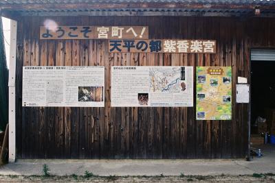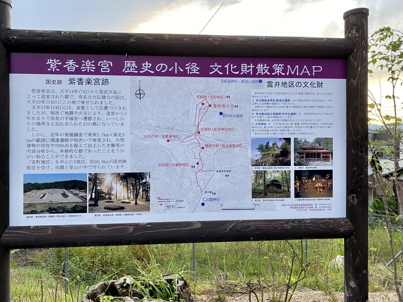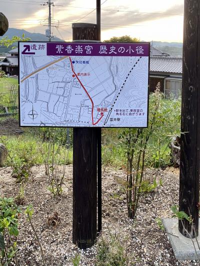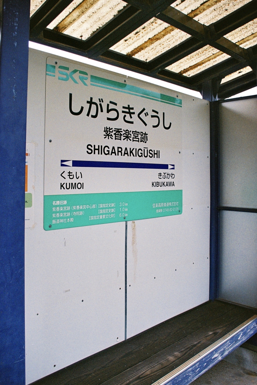 駅名の由来は紫香楽宮跡によるものであるが、あくまでも開駅当時の説に基づいており、現在紫香楽宮跡の中心部とされる宮町遺跡に向かうには30分程歩かなければなりません。