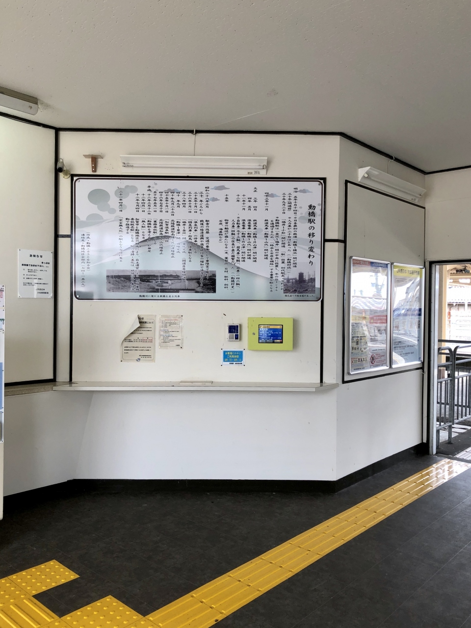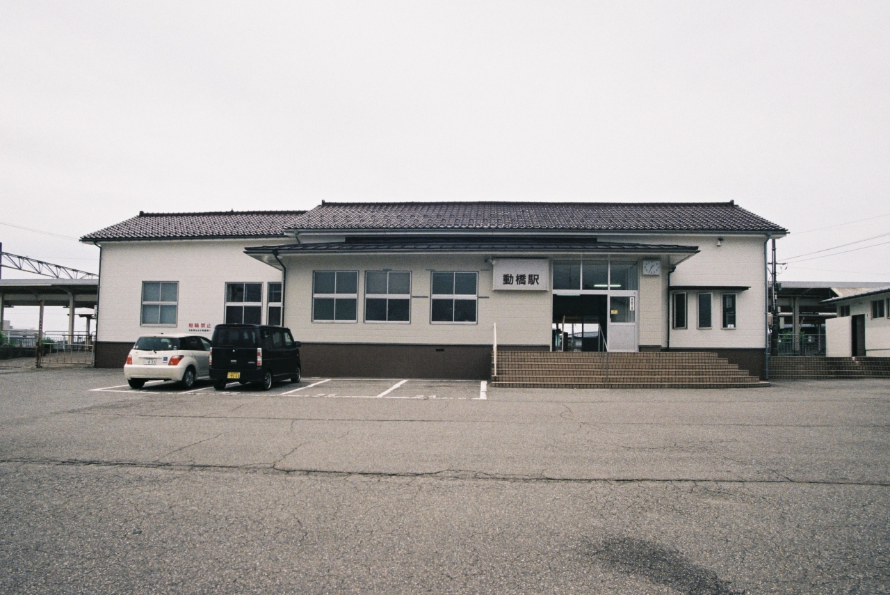 北陸に限らず温泉旅館の廃業が増える中、加賀温泉郷も例外ではない。その上アクセスする手段すらない駅を利用することもないであろう。北陸鉄道跡地を利用した駐車場・動橋郵便局はそれなりの利用はあるようだが、駅に限って言えば皆無であった。しかし住民の方々の手によってであろう清掃は行き届いており、荒れた感は受けなかった。また旧窓口跡に〝動橋駅の移り変わり〟のパネルが掲げられており、地域から愛されている駅舎であることを伺い知ることができる。