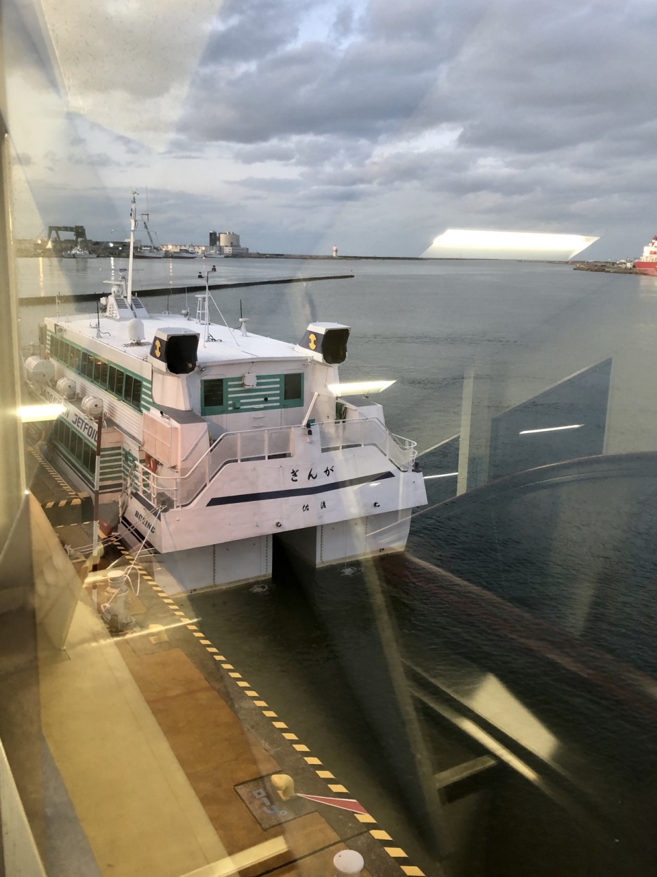 天気が良ければ快適~な旅になるのですが特に冬季の場合は海が時化ると欠航する確率も高いのが事実です。また地元でも人によってまちまちなのですが、もしジェットフォイルが運航されるのであれば、波を切って走るためフェリーよりも快適だと言われます。実際に乗り比べるとやはり船体の重量とスタビライザーによってコントロールできるフェリーの方が揺れないのではと思いましたが、乗船時間は半分で済むことを考えれば、耐える時間は短くて済むのかとも思います。