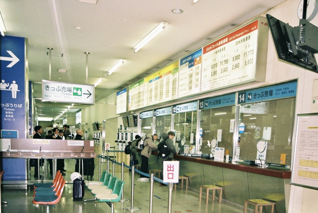 佐渡から新潟へと戻る際、予定変更のためジェットフォイルに搭乗することになりました。チケット購入はカード対応の自販機で、旅行会社のバウチャーや各種割引料金での発券のために窓口があるようになっていました。