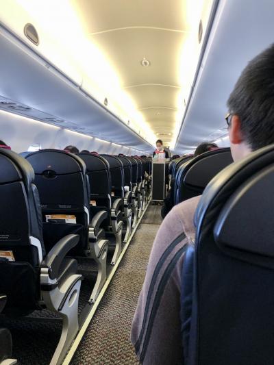 やはりこの時期コロナウィルスで外出を控える方が多いようで、他の乗客のほとんどはビジネス客と思しき方ばかり。加えて搭乗率は50%程度という状況でした。マスクに手袋姿のCAさんが2人乗務をされていましたが、いつもとは違うサービス提供で大変だろうと感じました。