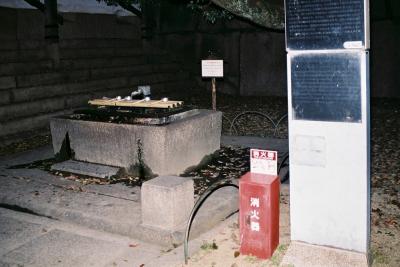 徳川時代に大阪城改築を行った際本丸御殿裏に設けられた銀明水の井戸の井筒。当時は警備にあたる役人の飲用水に使われていた。昭和6(1931)年に大阪城内に陸軍第四師団司令部が置かれた際に現在地に移設され、水道引いたものが現在のものになっている。