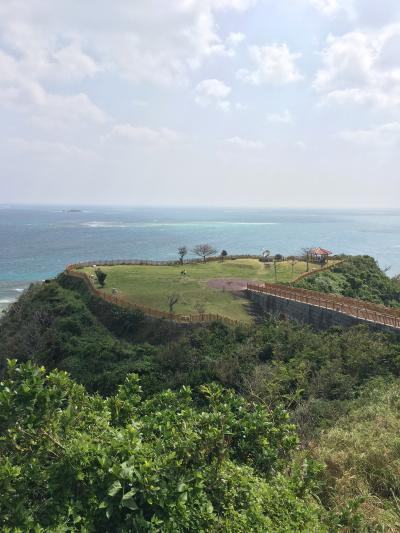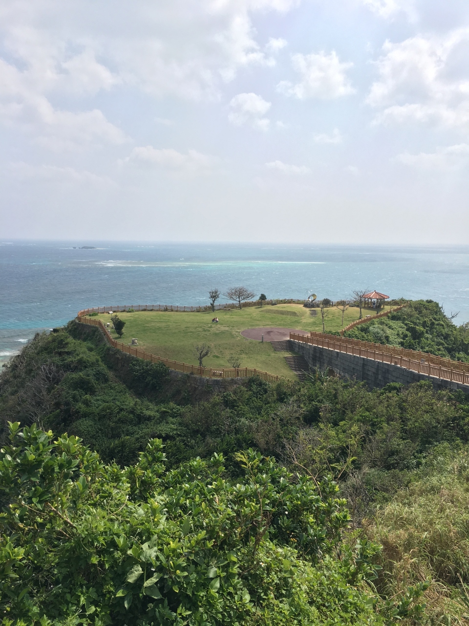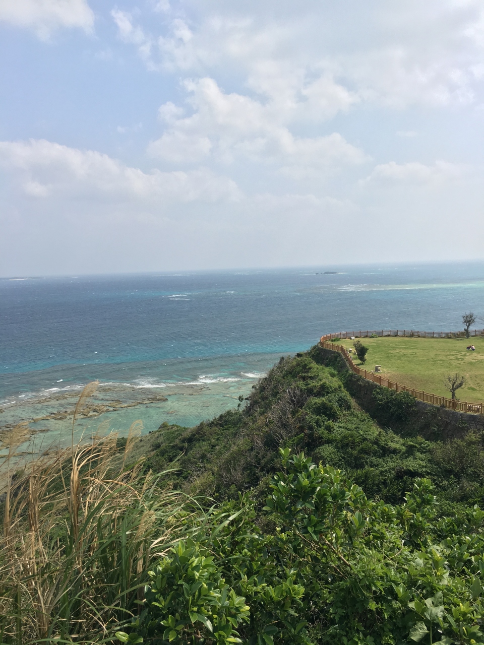 がんじゅう駅・南城に車を停め、海方向へと歩くこと数分。眼下にコバルトブルーの海が広がる景色に遭遇します。知念岬公園、太平洋に迫り出すような位置にあり、天気が良ければ視野以上のワイドビューが楽しめる公園になっています。