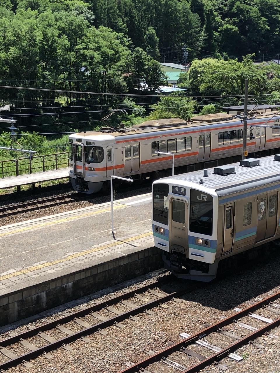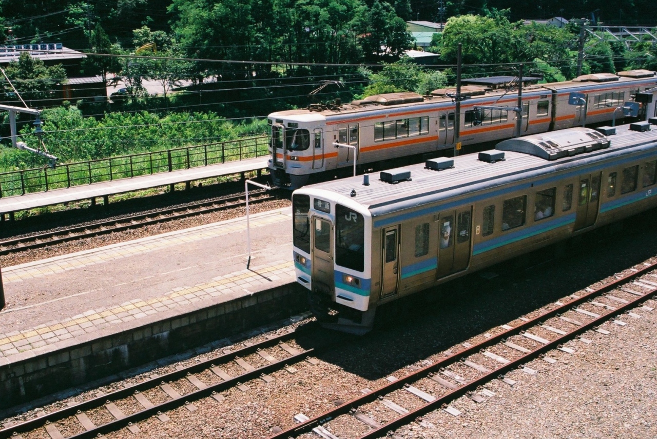 列車の離合風景は、奈良井駅から少し塩尻方面へと進んだ山手がポイントです。停車中と入線してくるそれぞれの列車がどなたでも簡単に撮れるポイントになっています。