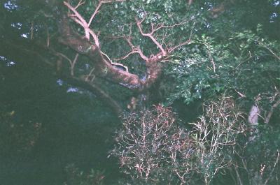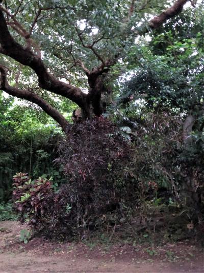 首里城から南へと進み、石畳道を2/3程下りた左側に内金城嶽(ウチカナグスクタキ)があります。その境内に自生するアカギの大木がこの〝首里金城の大アカギ〟です。樹齢200年と言われる幹の周りが20mもある大アカギが5本生えており、その周りに増えた若木を含めて住宅地らしくない鬱蒼とした森を構成しています。