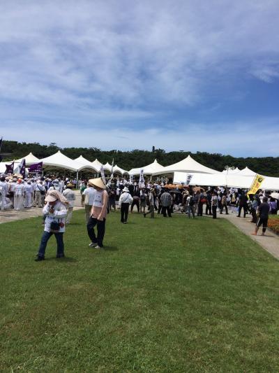 当日の混雑は想像を絶するものがありました。許可車両以外は会場となる平和祈念公園駐車場に原則入ることができずに付近の特設駐車場に車を停めて、シャトルバスで向かうことになります。また?式典参加者?とカウントされる数には、実際に現地で見た人の数と大きな開きを感じますが、この式典参加者とは?手続きを取って追悼式典会場に入った方?の数の総数であり、私も含めた?外野参加?は人数に入っていません。マスコミの発表では一日で30,000人位は来場者がいたとも言われていました。