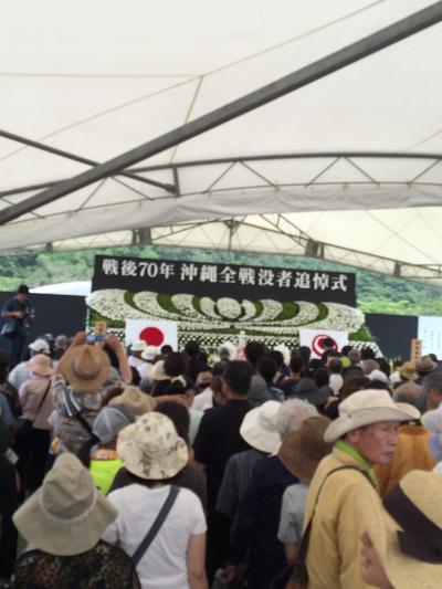 今年は戦後70年の節目を迎えるにあたり報道発表では5,400人とは言われていますが、いつもよりはるか多くの人々の来訪があったようです。11:50から式典が始まり12:00から1分間の黙とうを捧げた後式典が進みます。翁長知事の平和宣言には?なぜこの場で??と思える拍手があったと思えば、その後の安倍総理の時には心ないヤジがぽつりぽつり…。誰が言ったかという問題ではなく、追悼式典という一年に一回のことを台無しにする?行為そのもの?に対して怒りを感じました。特に今年は戦後70年という節目の年だったこともあり、沖縄戦に徴兵された兵士のご家族の方々が、今回の慰霊の日の訪沖を最後にしようと考えておられたことも多いと聞いていました。その最後の式典を台無しにする行為…、これを支持する考えが理解できません。