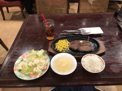 今回は宿泊時の朝・夕食をこちらで頂きました。夕食は書かれている通りの『ステーキ』で、サラダ・スープ・ライスはセルフサービスのお代わり自由。ショボいのが来るのか…思っていたら本格的過ぎるものが出てきてびっくりしました。元々草食系のためサラダ主体に考えていたらのボリュームだったので慌てて配分を変更し、写真のように落ちつけました。ひとつだけ残念だったのがサービスのソフトドリンク。ダイエットコークを頼んだところ味がしない代物でした…。