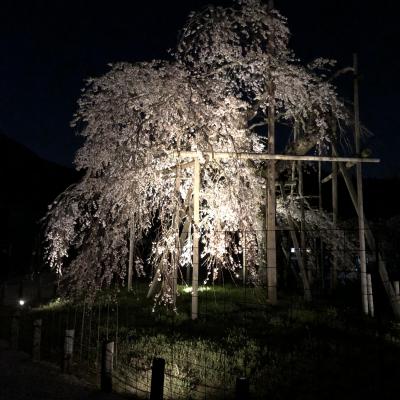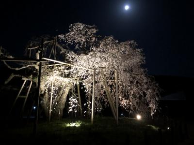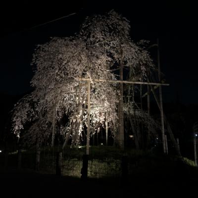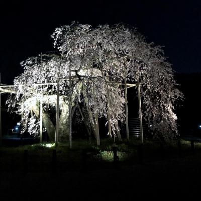 暗闇の道を走り続けると集落のある左手にライトアップされた桜の木が目に入りました。滋賀県内有数の桜名所として知られている〝畑のしだれ桜〟、樹齢400年と言われるエゾヒガンザクラの古木は甲賀市指定文化財(天然記念物)指定を受けているものでもあります。