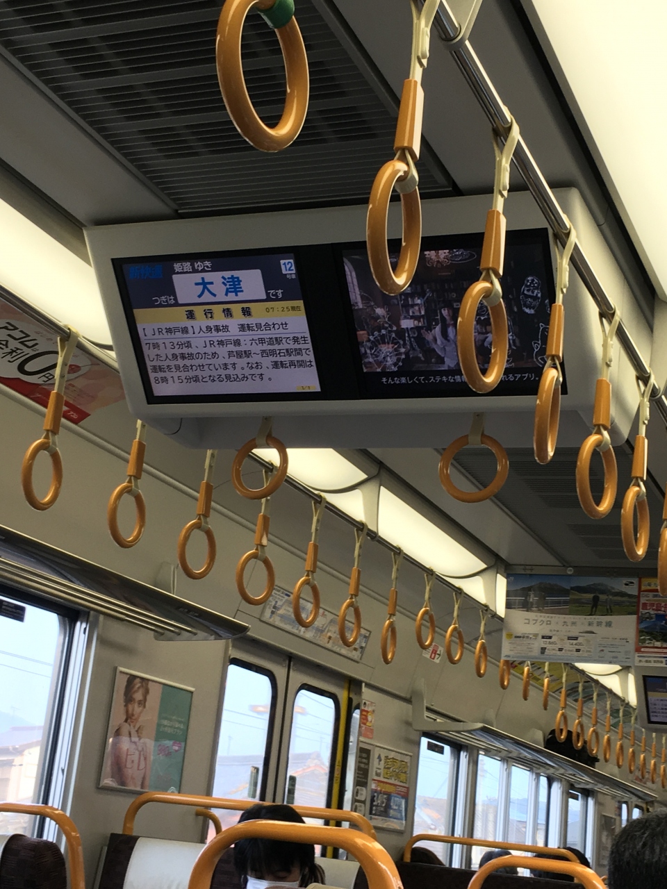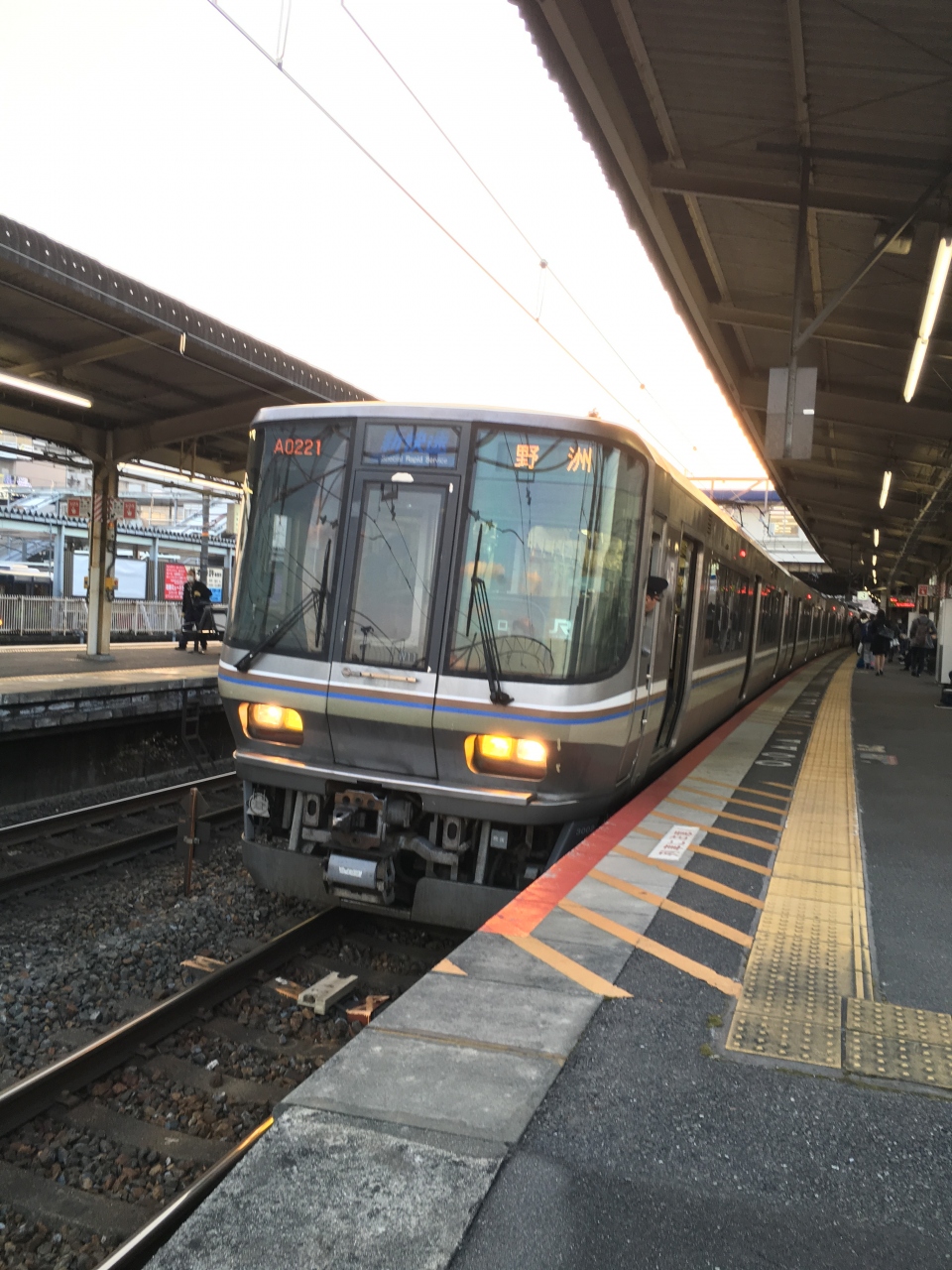 転換型セミクロスシートは通勤時は座席幅がある分だけ窮屈感は否めないものの、昼間では座席方向を変えて向かい合うこともでき、都市型電車に乗っていることすら感じさせないものになります。先頭車両がちょっと尖った223系、平らな225系とどちらが好みかはあるのかも知れませんが、なんとなく愛嬌すら感じられる車両はやはり関西の顔には違いありません。- 旅行時期